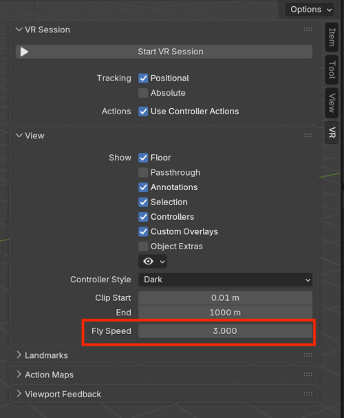 - フライ速度を設定する新オプションが、サイドバー→VR Session(VRセッション)に追加。
