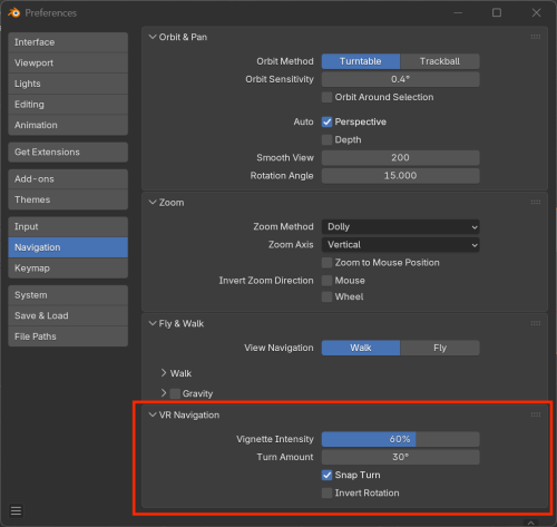 - "VR Navigation"(VR ナビゲーション)セクション(プリファレンスの Navigation(視点の操作)タブ内)では、ビネットの強さやスナップターンのON/OFF、ターン角度、カメラの回転方向の反転が設定できます。